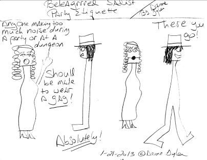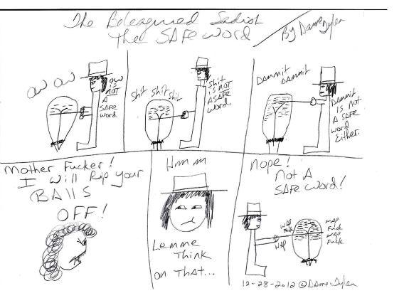 A collection of chicken skratch cartoons I’ve (very badly) drawn to poke fun at a wide range of concepts, misconceptions, stereotypes and silly situations found in the real world and cyberland realms of BDSM.